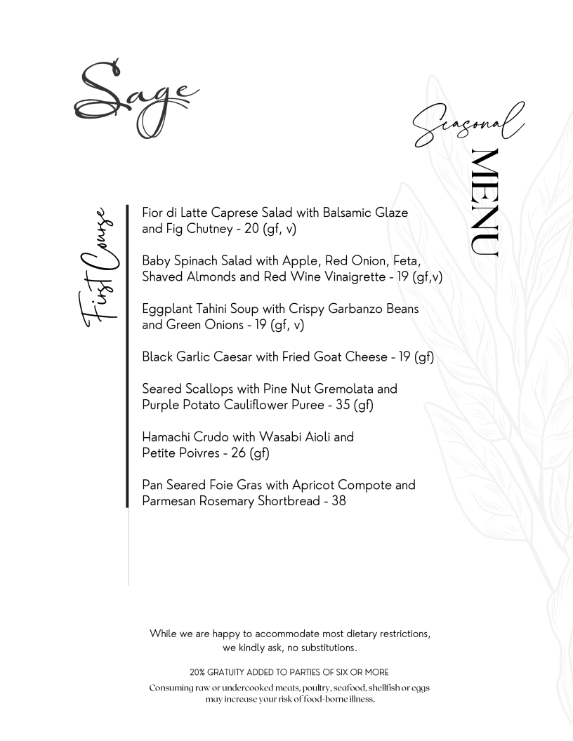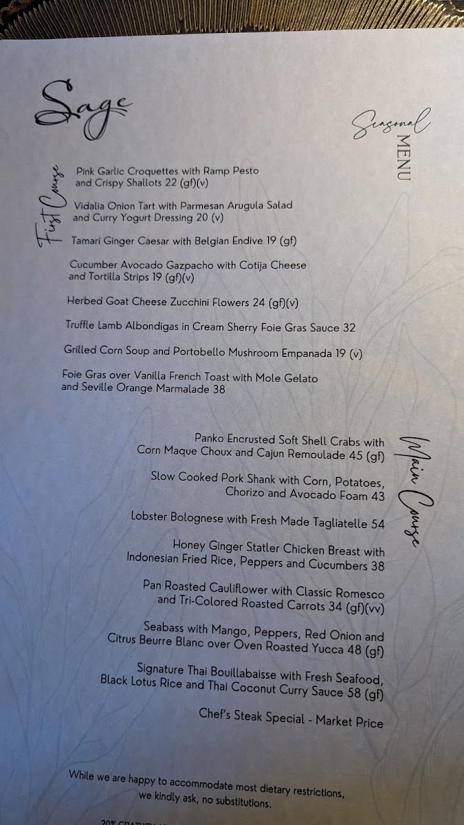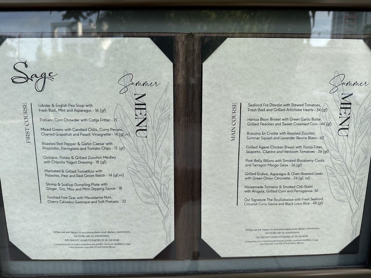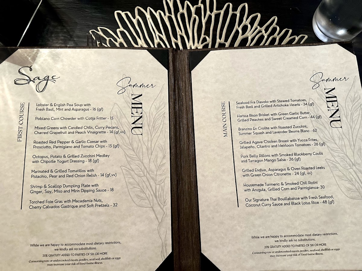 Welcome to Sage - Sarasota, a culinary gem nestled in the heart of Sarasota, Florida. This delightful restaurant invites guests to savor an unforgettable dining experience, showcasing seasonal, artfully crafted dishes. The menu features vibrant starters like Burrata Cheese with Seasonal Fruit and heartwarming Sopa Azteca, priced from $19 to $24. For mains, indulge in the sumptuous sea bass, accompanied by roasted yucca and fresh accents, a favorite among diners.